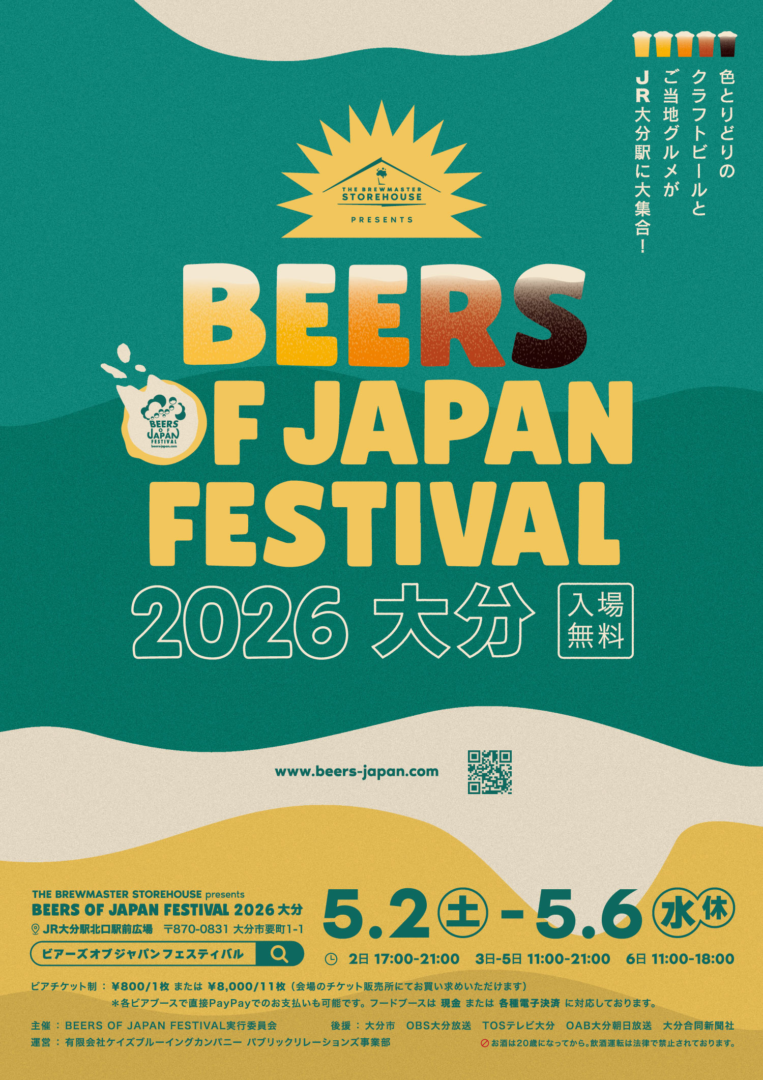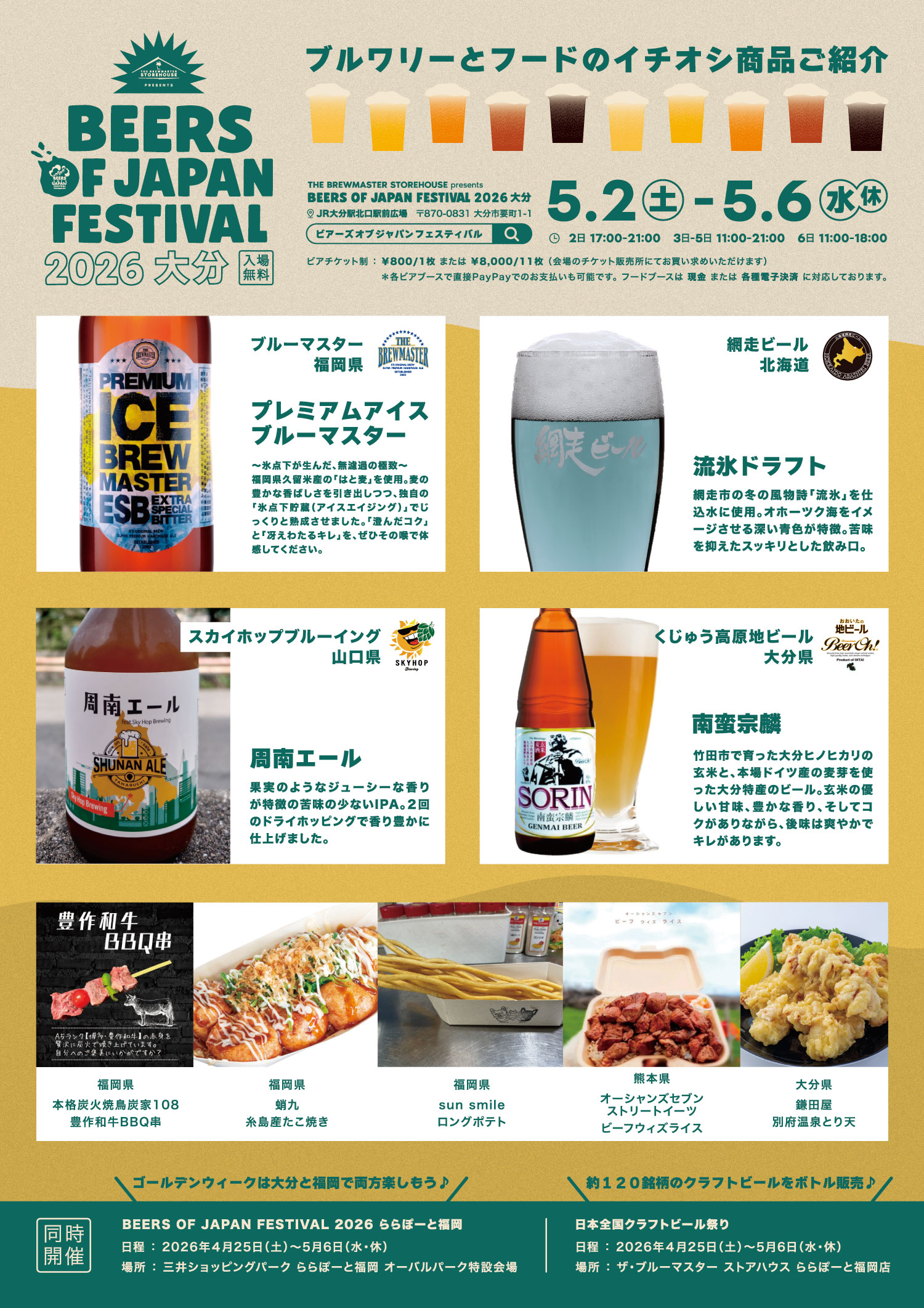 BEERS OF JAPAN FESTIVAL 2026 大分 5/2 5/6 11時~21時(初日5/2は17時オープン、最終日5/6は18時まで) JR大分駅北口駅前広場Google MAP BREWERY BEER LINEUP すべて★網走ビールスカイホップブルーイングブルーマスターくじゅう高原地ビールすべて ★ 網走ビール スカイホップブルーイング ブルーマスター くじゅう高原地ビール 2024年8月30日ブルーマスターのんあるドラフト2026年3月24日スカイホップブルーイングブラックIPA2021年8月19日ブルーマスターエクスポートIPA2026年3月24日スカイホップブルーイングホッピーヴァイツェン2021年3月19日網走ビールABASHIRI Golden Ale2021年8月18日くじゅう高原地ビールBeerOh!花2021年3月19日網走ビール桜桃の雫2024年4月20日スカイホップブルーイングセゾン2021年3月19日網走ビール流氷ドラフト2021年8月18日くじゅう高原地ビールBeerOh!星2021年3月19日ブルーマスターかぼす&ハニー2022年9月2日網走ビールAbashiri White Ale2021年3月19日ブルーマスタープレミアム アイス ブルーマスター2021年8月18日くじゅう高原地ビールBeerOh!風2021年3月18日ブルーマスターヒーリングタイム2021年8月18日くじゅう高原地ビール南蛮宗麟(玄米ビール)2024年4月20日スカイホップブルーイング周南エール2021年3月19日ブルーマスターブルーマスター2024年4月20日スカイホップブルーイングプレミアムラガー FOOD PICK UP 2026年3月24日本格炭火焼鳥 炭家108豊作和牛BBQ串2026年3月24日鎌田屋別府温泉とり天2026年3月24日蛸九糸島産たこ焼き塩マヨネーズ2026年3月24日sun smileロングポテト2026年3月24日オーシャンズセブンストリートイーツビーフウィズライス